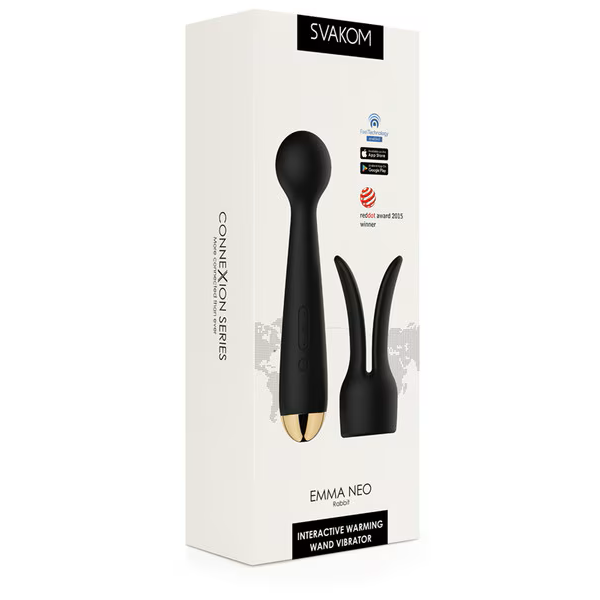 Emma Neo has a round head and flexible neck so broad stimulation can be easily delivered to the clitoris or other external erogenous zones. The head can warm to 38°C and be used with the rabbit ears attachment for fluttering stimulation. Settings also include Intelligent Mode, where vibrations mimic the rhythm of sex. For customization, long-distance play and partner interaction, use Emma Neo with the SVAKOM App.