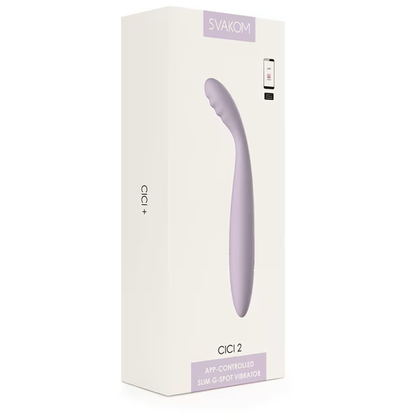 uncomfortable. An optional heating function warms the shaft head to 38°C to boost arousal. A memory function resumes on the last setting used for internal and/or external vibration. A travel lock stops accidental turn-ons. For customization, long-distance play or partner interaction, use Cici 2 with the SVAKOM App.