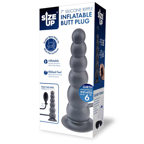 Pump-up your play! Enjoy every bead of this 7 inch silicone ribbed butt plug that's equipped with a sturdy suction cup base and quick-release valve for customisable, hands-free pleasure. Enjoy extra stimulation with the Size Up Silicone Ripple Butt Plug’s ribbed textures, offering added internal pleasure. This ripple but plug increases up to 8 inches in length and 6 inches in girth when fully inflated.
