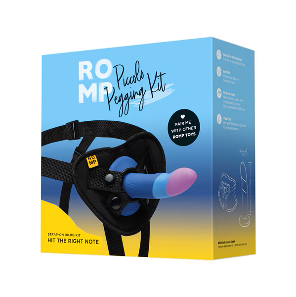 Hit the right spot with a little help from the ROMP Piccolo Pegging Strap-On Kit. Made from velvety-smooth silicone, the vibrant colourway dildo boasts a non-realistic design, a curved 5-inch shaft and a tapered tip for targeted G-spot or P-spot stimulation. With a flared suction-cup base, simply slide the dildo into the adjustable harness and enjoy.