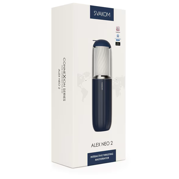 Alex Neo 2 has a thick sleeve lined with soft domes that massage the penis while thrusting technology mimics sex rhythms. Settings are controlled via a button on the toy. For customization, long-distance play and partner interaction, use Alex Neo 2 with the SVAKOM App. Alex Neo 2 has a durable case with grooves for improved grip and a protective cap. Only clean the sleeve when removed from the case.